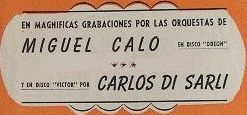 | Some stats Most of the time, the exact date of the edition is not known, but reasonable guesses can be made using the titles and artists that are mentioned, the style of the cover (e.g. editor Julio Korn had typical designs in the fourties and fifties) or other elements (e.g. the word nacional, as in Nacional Odeon, Discos Nacional...., a term that, by law, became reserved for matters of state in the early thirties). Of the ones listed here, it is my estimate that about 30% belong to the thirties or earlier, over 65% to the forties, and the remainder (just 3 cases) to the fifties or later. In the category of the forties (the most fascinating part to me) over 80% of the covers announce both Victor and Odeon recordings (was this a required balance of powers ?) and also among the undocumented recordings, Victor and Odeon are nearly equally represented, so it doesn't seem to be a company issue. The most encountered orchestras are those of Miguel Caló and Alfredo De Angelis, both 8 cases (an index by performer is included at the end) |