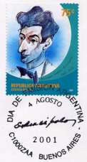 Tekst & Muziek : Enrique Santos Discépolo Van alle tangotekstschrijvers was E.S. Discépolo ('Discepolín', 1901-1951) ongetwijfeld de zwartgalligste, en misschien ook de meest moraliserende. Al zijn tangos met sociaalkritische inslag werden geschreven in de "decada infame" (1930-1943), periode van militaire staatsgrepen, economische ontwrichting en armoede (volgend op de beurscrash in de Verenigde Staten) maar ook corruptie en economische schandalen : Yira, Yira...(1930, Het draait en draait...), ¿Qué Sapa Señor? (1931, Wat gebeurt er, meneer ?) en ook deze Cambalache (1934). Op verschillende momenten in de Argentijnse geschiedenis werden deze tangos verboden, of op zijn minst "afgeraden", ook nog in de zeventiger jaren, onder de militaire dictatuur. In de tweede "decada infame" die Argentinië beleefde aan het eind van de 20° eeuw werd en wordt nog vaak uit deze tekst geciteerd. Links: postzegel met beeltenis van Discépolo, uitgegeven tijdens de grote overzichtstentoonstelling n.a.v. de honderdste verjaardag van zijn geboorte (1-26 aug. 2001, Palais de Glace, Buenos Aires). |